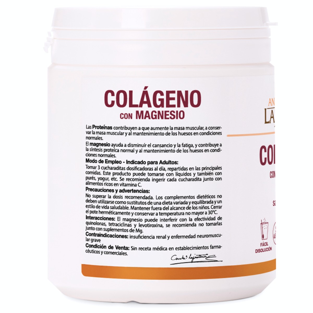 Contenidos medios por dosis diaria de 3 cucharaditas de postre (7,5 g): colágeno 6,9 g; magnesio 137 mg (36% VRN*).