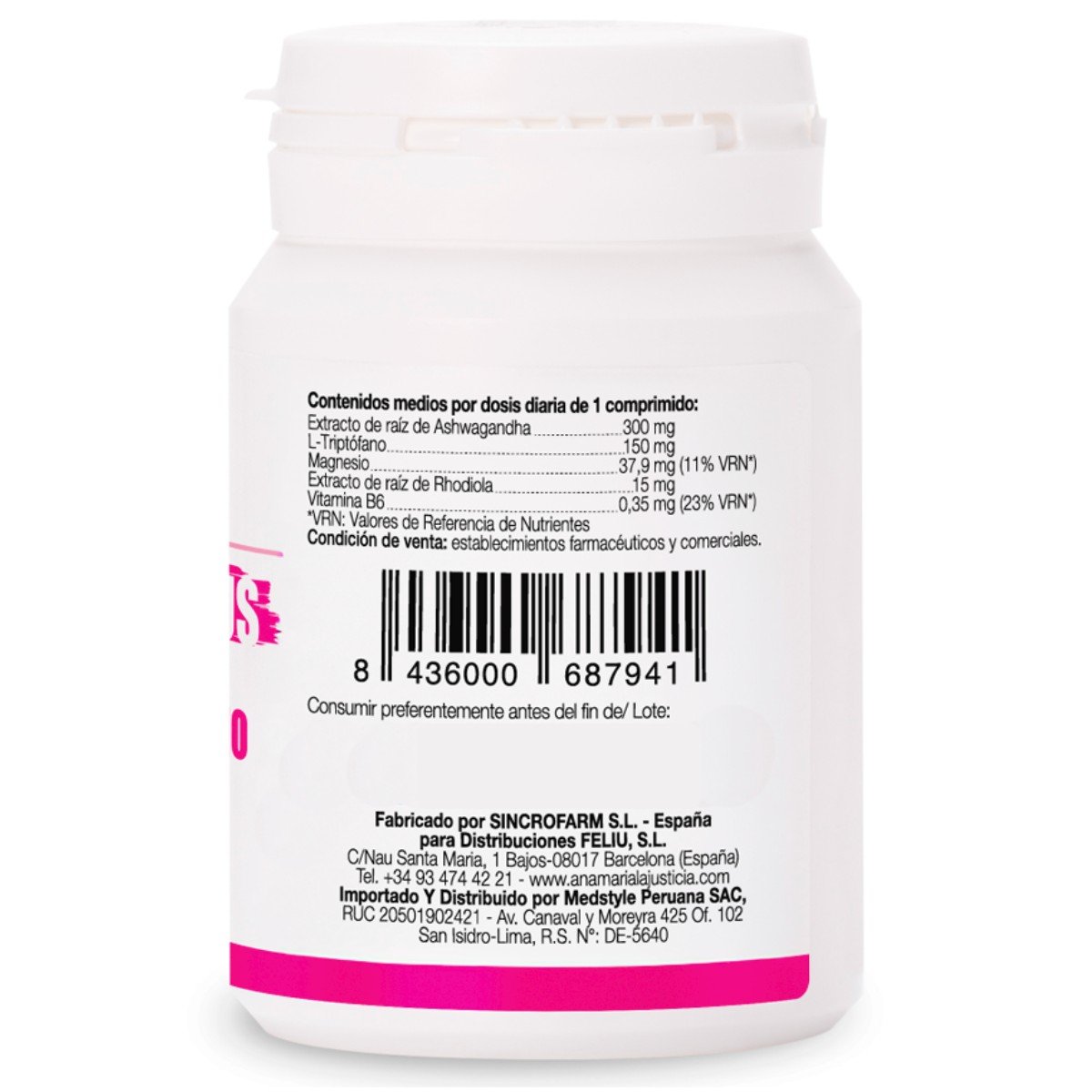 Contenidos medios por dosis diaria de 1 comprimido: Extracto de raíz de Ashwagandha 300 mg, L-triptófano 150 mg, magnesio 37,9 mg (11% VRN*), extracto de raíz de Rhodiola 15 mg y vitamina B6 0.35 mg (23% VRN*).